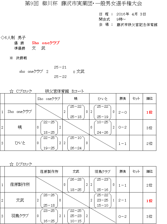 平成27年度 三觜杯藤沢地域冬季大会兼連盟杯争奪大会 大会結果