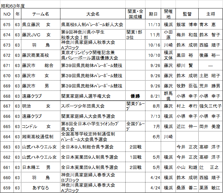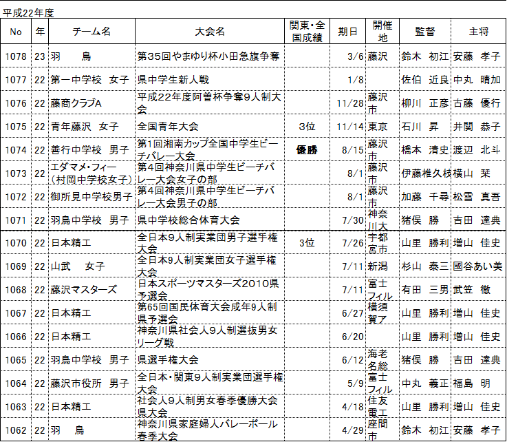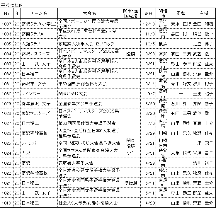歴代記録は藤沢市の小学校、中学校、高校、実業団、一般、家庭婦人の各チームが県大会以上の大会で優勝した成績を記録したものです。